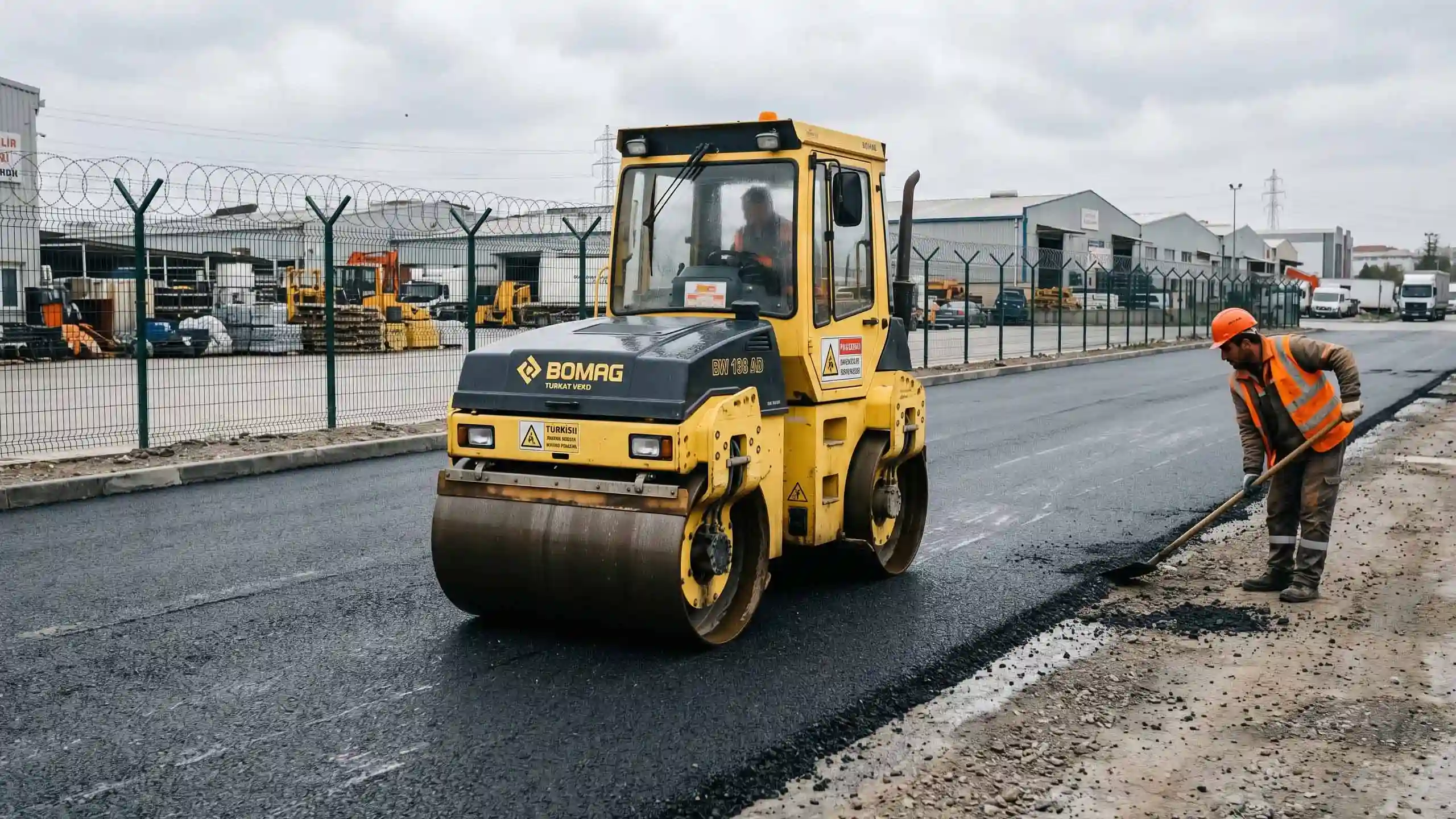 Prefabrik cephe panelli fabrika yanı dar şerit asfalt kaplaması. BOMAG 135 AD ile hassas sıkıştırma.